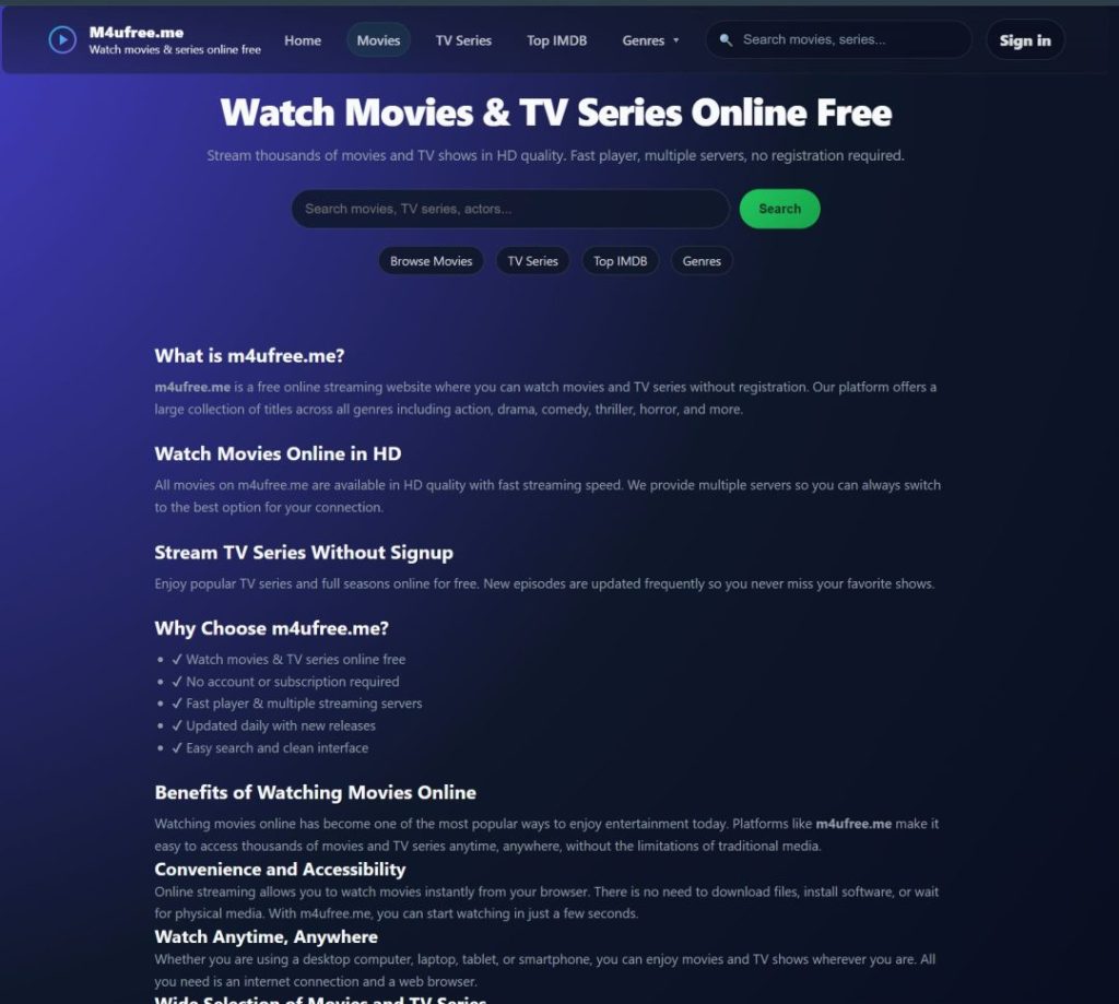 m4ufree.me is a newly launched online movie and TV series platform built to deliver a smooth, fast, and user-friendly streaming experience. The website focuses on providing access to a wide range of content, including: